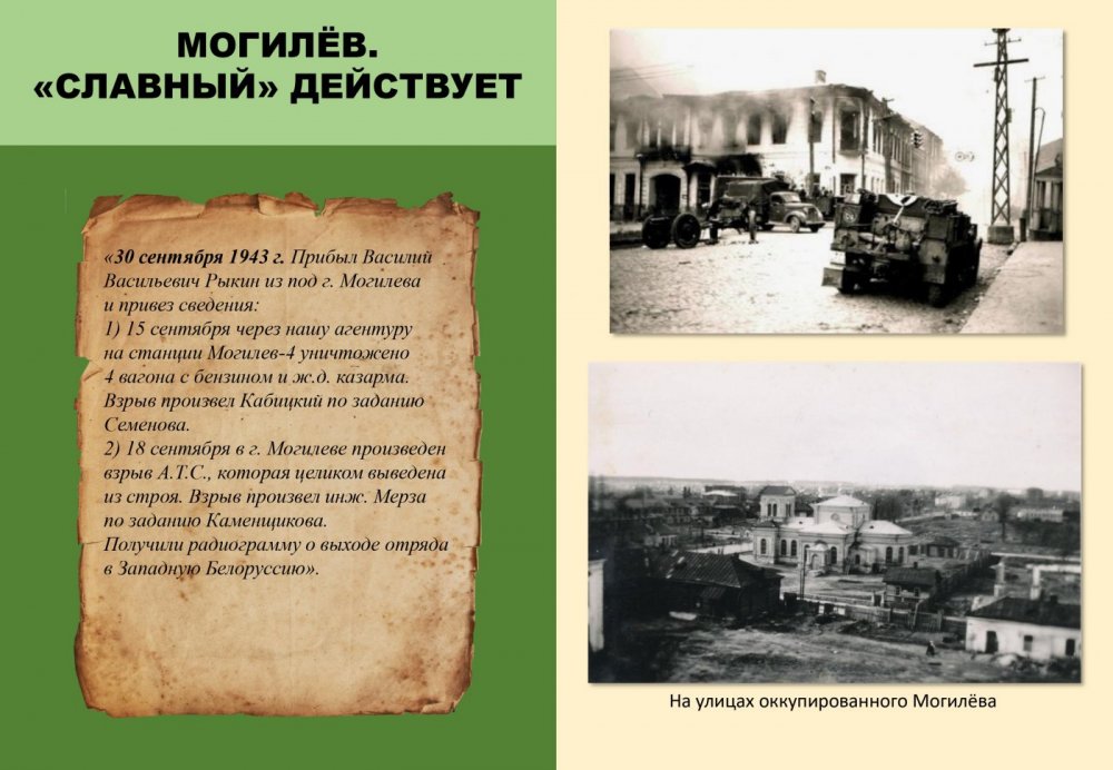 Предлагаем вашему вниманию виртуальную выставку «Славный путь «Славного», которая рассказывает о боевом пути отряда специального назначения НКГБ «Славный». В основе выставочного проекта лежит дневник начальника штаба Михаила Оборотова. Во время Великой Отечественной войны отряд почти два с половиной года действовал в глубоком тылу врага, с боями пройдя 1500 километров. 15 месяцев отряд находился в Брянской области, остальные 15 месяцев – на территории Беларуси. 8 месяцев «Славный» базировался на территории Кличевской партизанской зоны и провёл множество боевых операций совместно с кличевкими партизанами.